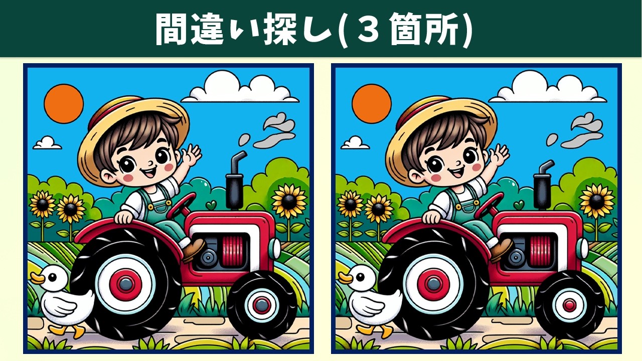 【間違い探し】3つの違いに気付ける!?難しいイラストの脳トレ動画で、記憶力向上・老化防止!【クイズ】 間違い探し 2024.08.122024.08.13 間違い探し動画 今回は「【間違い探し】3つの違いに気付ける!?難しいイラストの脳トレ動画で、記憶力向上・老化防止!【クイズ】」です! チャンネル登録する!