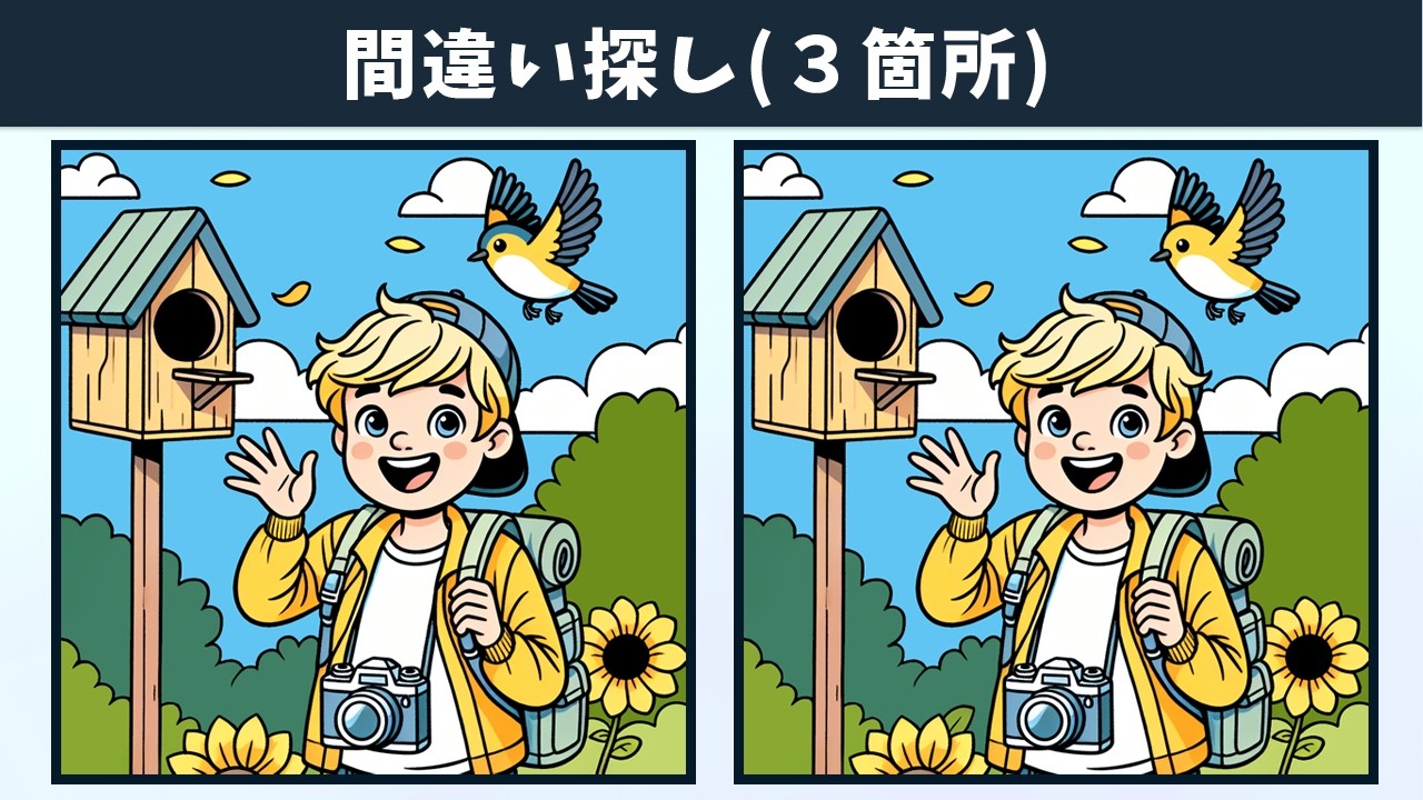 【間違い探し】気軽に脳トレを習慣に!左右の絵の3つの違いを見つけて、記憶力や認知力を高めよう!難問編【クイズ】 間違い探し 2025.01.112025.01.12 間違い探し動画 今回は「【間違い探し】気軽に脳トレを習慣に!左右の絵の3つの違いを見つけて、記憶力や認知力を高めよう!難問編【クイズ】」です! チャンネル登録する!