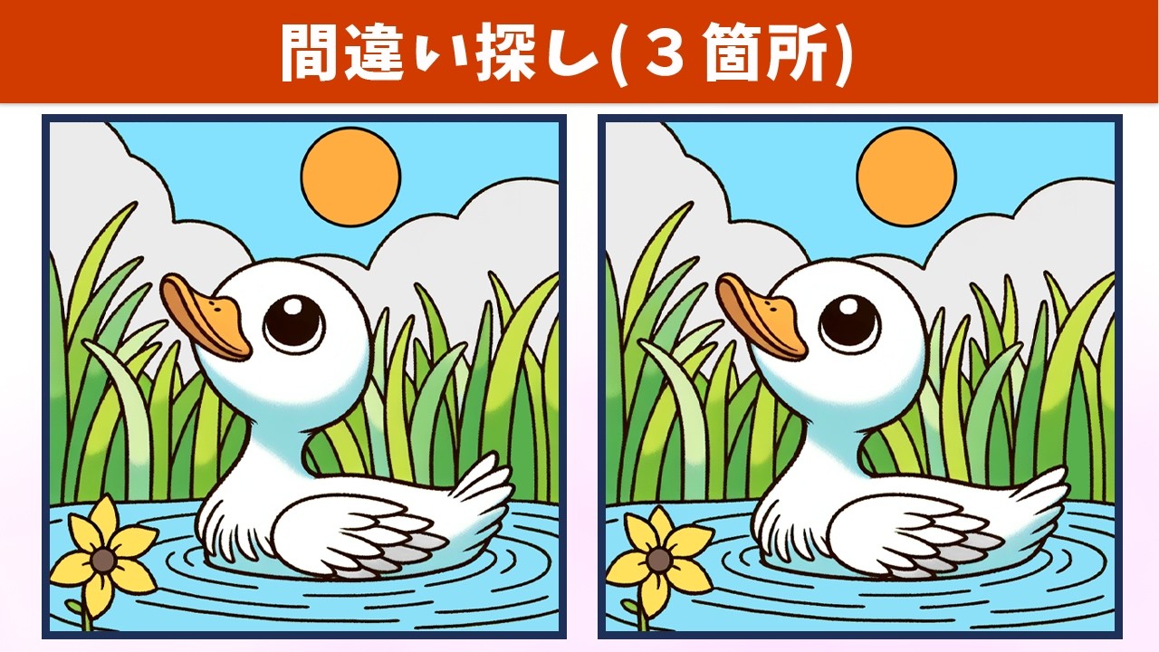今回は「【間違い探し】脳トレを日常の習慣に!左右のイラストの3⃣箇所の違いを見つけ出して、記憶力・認知力向上!最後は超難問!【クイズ】」です!