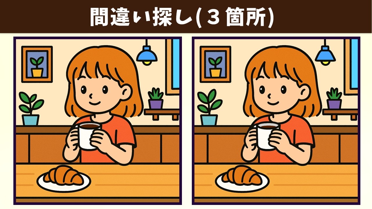 【間違い探し】楽しみながら脳トレをして、記憶力や認知力を高めよう!イラストの3つの違いを見つける動画で、頭の体操を習慣化!難問編【クイズ】