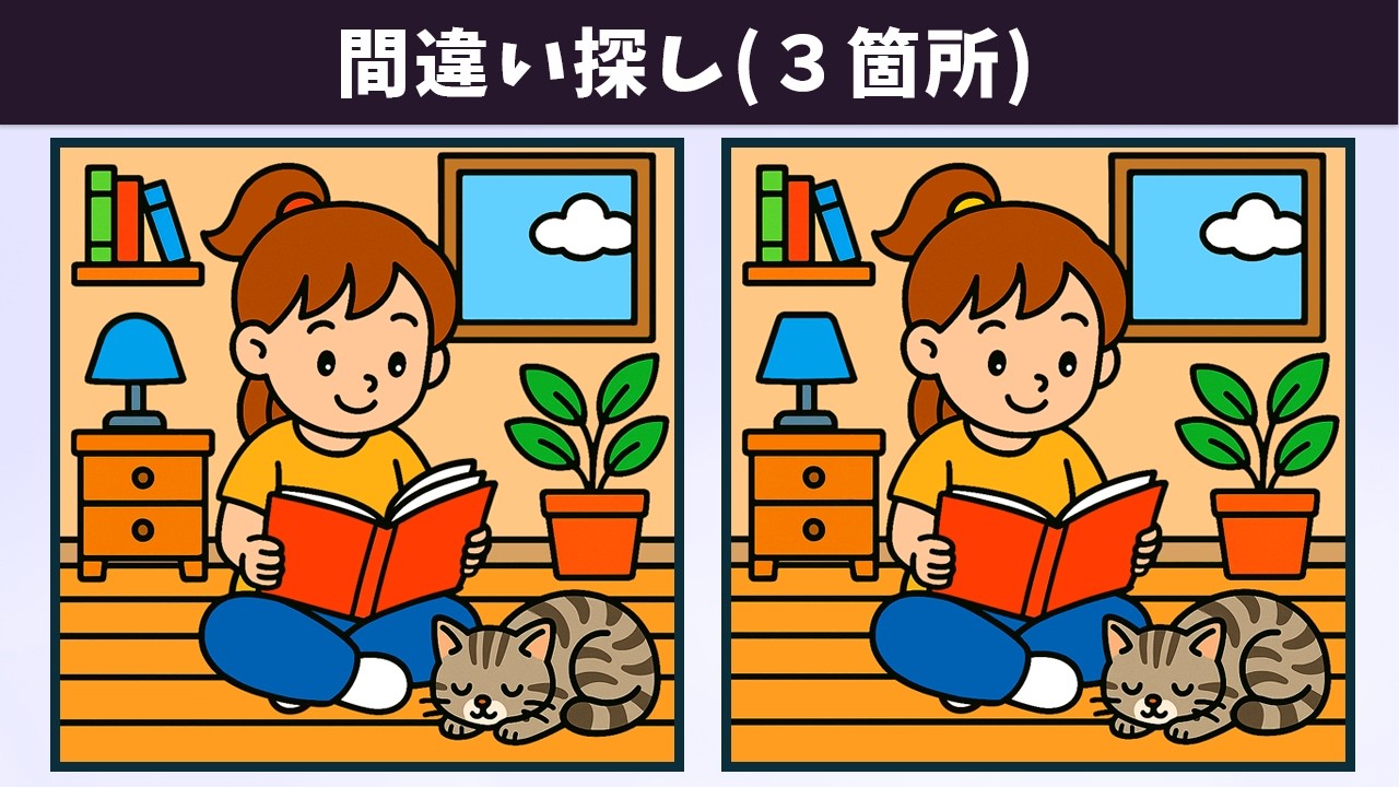 【間違い探し】記憶力向上・老化予防におすすめな脳トレ!90秒以内に3つの違いを探し出せる!?【クイズ】 間違い探し 2025.07.082025.07.09 間違い探し動画 今回は「【間違い探し】記憶力向上・老化予防におすすめな脳トレ!90秒以内に3つの違いを探し出せる!?【クイズ】」です! チャンネル登録する!