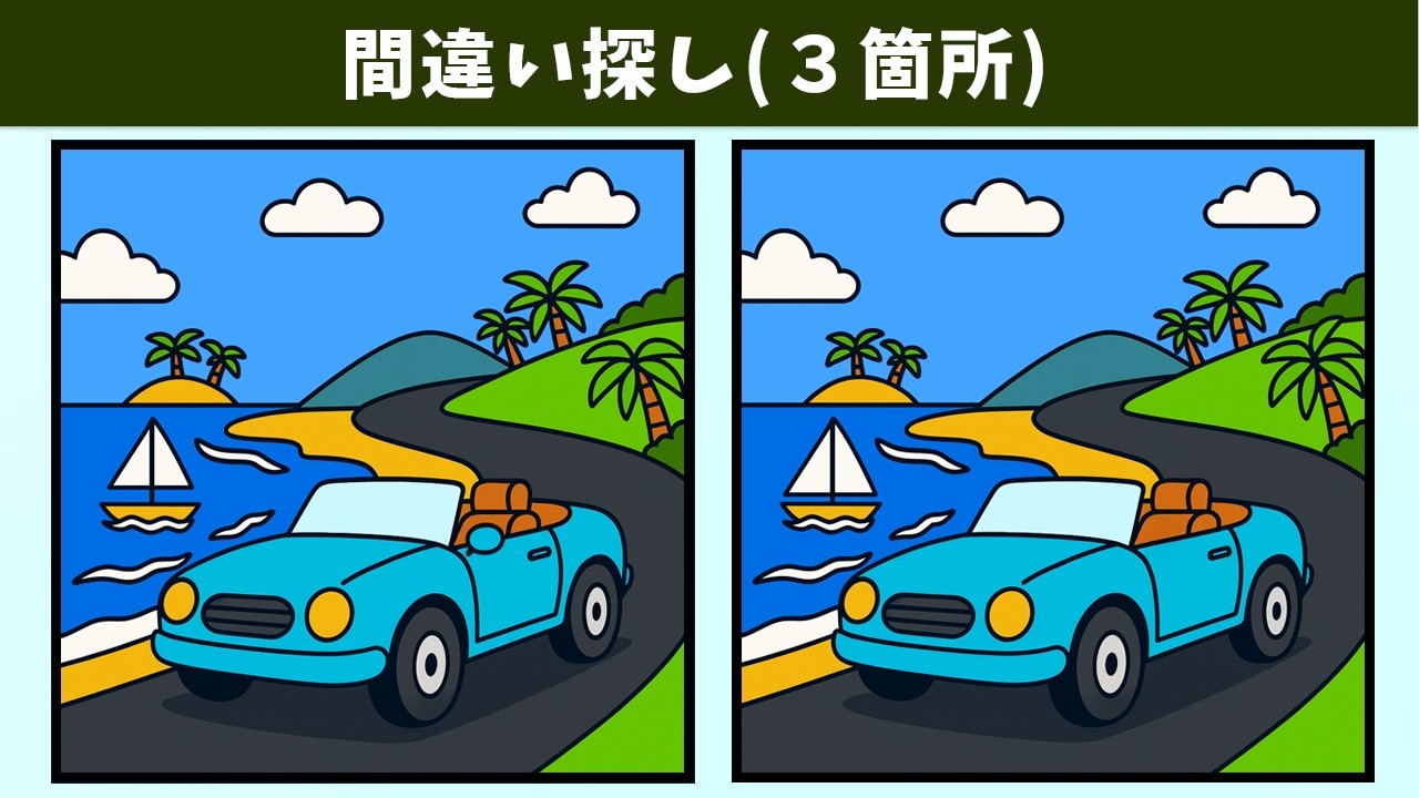 【間違い探し】脳トレにおすすめ!子どもから高齢者まで、簡単・気軽に頭の体操!認知力・集中力アップ!【クイズ】 間違い探し 2025.10.092025.10.10 間違い探し動画 今回は「【間違い探し】脳トレにおすすめ!子どもから高齢者まで、簡単・気軽に頭の体操!認知力・集中力アップ!【クイズ】」です! チャンネル登録する!