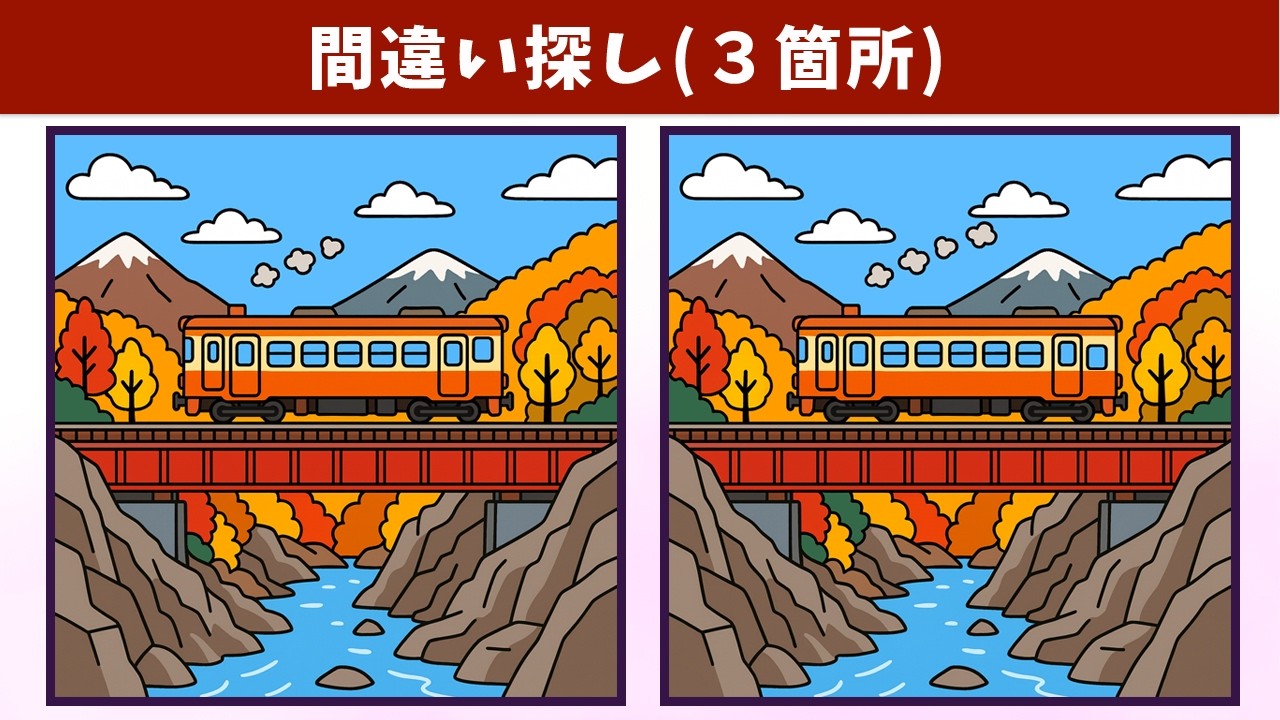 【間違い探し】脳トレや老化防止を楽しみながら!イラストの3つの違いを見つけて、認知力・記憶力を高めよう!【クイズ】 間違い探し 2025.11.292025.12.24 間違い探し動画 今回は「【間違い探し】脳トレや老化防止を楽しみながら!イラストの3つの違いを見つけて、認知力・記憶力を高めよう!【クイズ】」です! チャンネル登録する!
