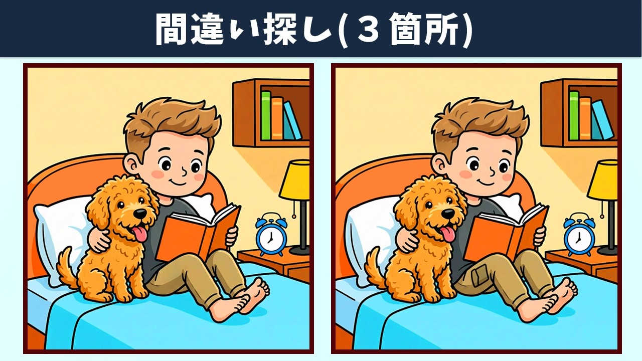【間違い探し】脳トレで記憶力向上や認知症予防!いつでも簡単・気軽にアハ体験・頭の体操!イラスト編【クイズ】 間違い探し 2026.02.03 間違い探し動画 今回は「【間違い探し】脳トレで記憶力向上や認知症予防!いつでも簡単・気軽にアハ体験・頭の体操!イラスト編【クイズ】」です! チャンネル登録する!
